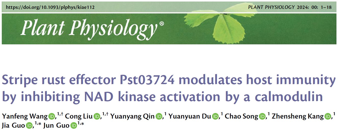 近日,bet365娱乐城 植物免疫研究团队郭军教授课题组在国际著名学术期刊 Plant Physiology 上发表了题为“Stripe rust effector Pst03724 modulates host immunity by inhibiting NAD kinase activation by a calmodulin”的研究论文。该研究鉴定到一个条锈菌特异的效应子Pst03724,发现其与TaNADK2竞争结合TaCaM3-2B以干扰TaCaM3-2B对TaNADK2的激活,进而抑制H2O2积累以促进条锈菌的侵染。bet365娱乐城 博士研究生王炎峰和刘聪为论文的共同第一作者,郭军教授及郭嘉副教授为该论文的通讯作者。